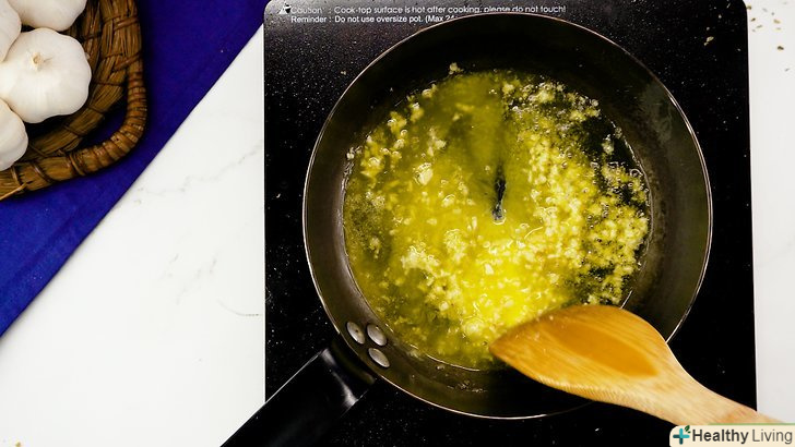 - Пропассеруйте часник.очистіть один зубчик часнику і роздушіть його плоскою стороною леза ножа. Покладіть часник в розтоплене масло і пасеруйте протягом однієї-двох хвилин на середньому або повільному вогні.[2]