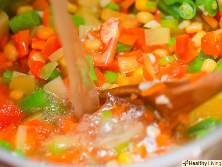 Варіть всі овочі в 4-6 склянках (1-1, 5 літра) води.якщо ви не використовуєте бульйон, візьміть велику каструлю, налийте в неї 4-6 склянки (1-1,5 літра) води, засипте в неї всі інгредієнти і варіть їх на дуже малому вогні протягом 45-60 хвилин.[8] одночасно засипте всі овочі, часник і спеції.- Каструля повинна бути досить великою, щоб крім води вмістити 4 склянки (1 літр) овочів.[9]