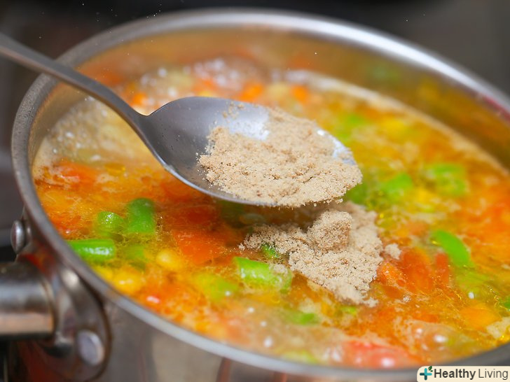 Додайте сіль, перець та інші спеції.після того як ви покладете трохи спецій, як слід перемішайте суп, а потім спробуйте його. Для початку краще додати 1 столову ложку (15 мілілітрів) спецій, в тому числі солі і перцю. Після цього можна досипати їх за смаком.- Будьте обережні-спеції легко додати в суп, але дуже складно прибрати з нього.