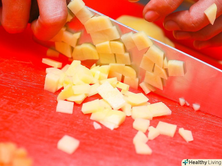Наріжте картоплю і селеру.поріжте і подрібніть їх за допомогою гострого ножа.[3] покладіть картоплю і селеру на стійку обробну дошку і наріжте їх кубиками. Для цього розріжте їх уздовж смужками шириною близько 2 сантиметрів, а потім поріжте ці смужки поперек.- В результаті у вас вийдуть кубики.