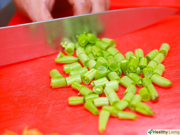 Поріжте зелену квасолю.на кінчиках стручків квасолі є маленькі стебла, які слід обрізати ножем або кухонними ножицями.[4] після цього наріжте стручки дрібними шматочками довжиною близько 3 сантиметрів. Використовуйте мірний стакан, щоб переконатися, що у вас вийшло близько 250 мілілітрів нарізаної квасолі. Замість зеленої квасолі можна використовувати стручковий горох або тонку спаржу.