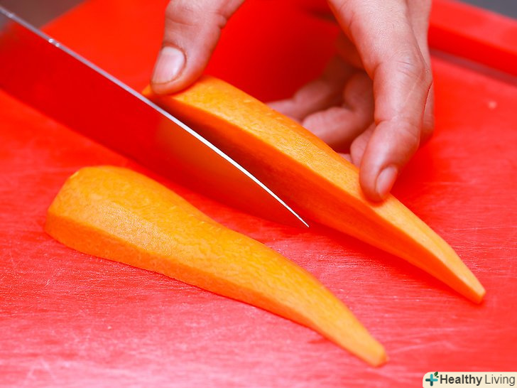 Наріжте тонкими скибочками моркву. при бажанні можна попередньо почистити морква, хоча це необов'язково. Не забудьте обрізати обидва кінчика моркви.[5] після цього розріжте моркву уздовж на дві половини.[6] потім поріжте моркву поперек на тонкі скибочки товщиною не більше 1,3 сантиметра.- Замість звичайної помаранчевої моркви можна взяти моркву інших сортів. Для овочевого супу підійде морква будь-якого кольору і смаку.
