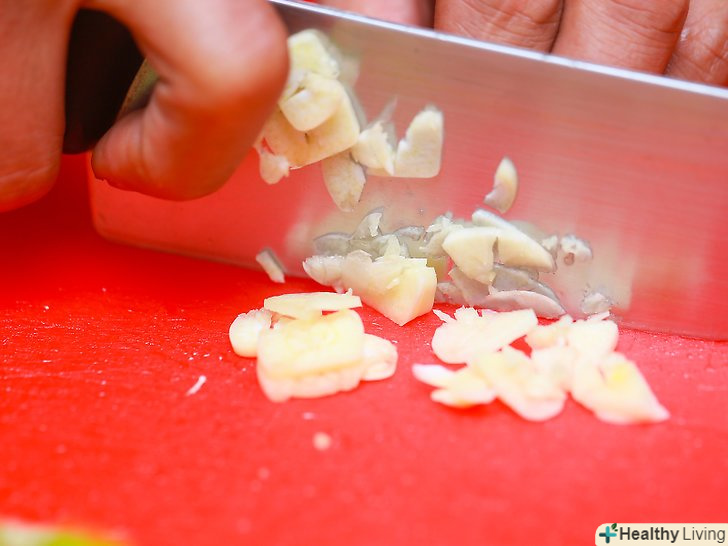 Подрібніть часник .якщо ви використовуєте свіжий часник, почистіть 2-3 зубчики. Очистіть їх від всієї шкірки і подавіть плоскою стороною леза ножа.[7] в результаті зубчики сплющаться, і їх буде легше порізати. Поріжте часник на великі скибочки, потім зберіть їх в купку і дрібно порубати ножем.-