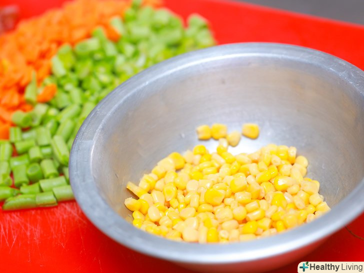 Візьміть 1 склянку (близько 175 грамів) кукурудзяних зерен.за допомогою мірної склянки відміряйте 250 мілілітрів кукурудзяних зерен. Для овочевого супу підійдуть заморожені або консервовані зерна. При бажанні замість кукурудзяних зерен можна використовувати горох.