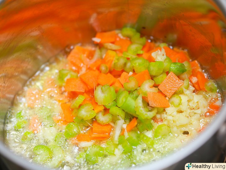 Додайте дрібно нарізаний часник, моркву, картоплю і селеру.після цього близько 8 хвилин продовжуйте готувати овочі на малому вогні. Овочі почнуть шипіти і пустять запах. Час від часу (приблизно раз на хвилину) помішуйте їх.