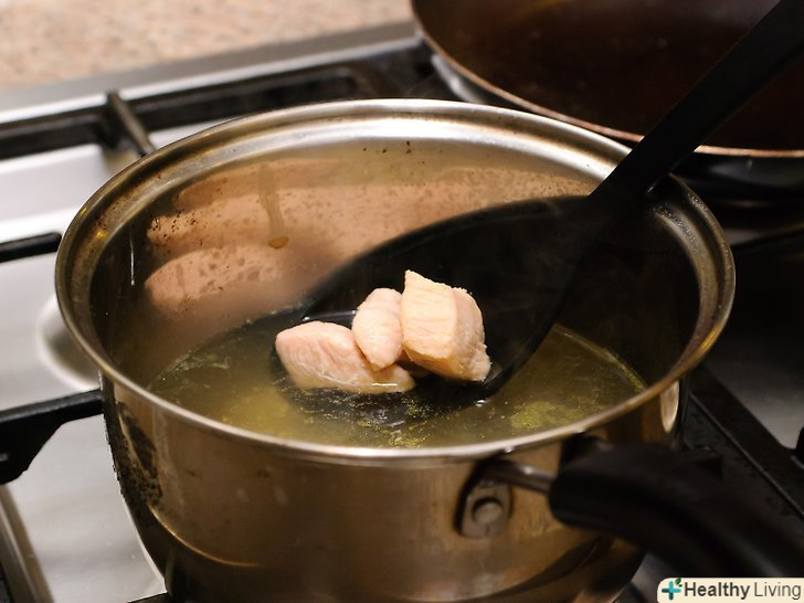 Приготуйте курячий бульйон.Налийте курячий бульйон у велику каструлю для бульйону. Поставте її на сковороду на помірно сильний або сильний вогонь і доведіть до активного кипіння.- Курячий бульйон додасть супу насичений смак. Якщо у вас немає курячого бульйону, то замість нього можна використовувати воду. Приготування курятини у воді насичує рідину смаком, тому в підсумку вийде помірно концентрований курячий бульйон.[1]