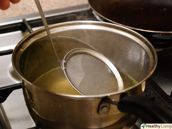 Процідіть жир з бульйону.якщо в курячому бульйоні залишився жир від курки, використовуйте ложку з отворами і зберіть частинки плаваючого холодцю. Відставте отриманий бульйон.- Проціджений бульйон знадобиться під час приготування макаронів і овочів. Він зробить смак супу насиченим.