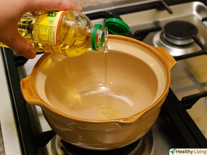 На середньому вогні нагрійте оливкову олію у великій чавунній каструлі.вилийте в шестилітрову каструлю 2 ст. л. оливкової олії. Перш ніж додавати інші інгредієнти, почекайте, поки нагріється масло (не менше хвилини).