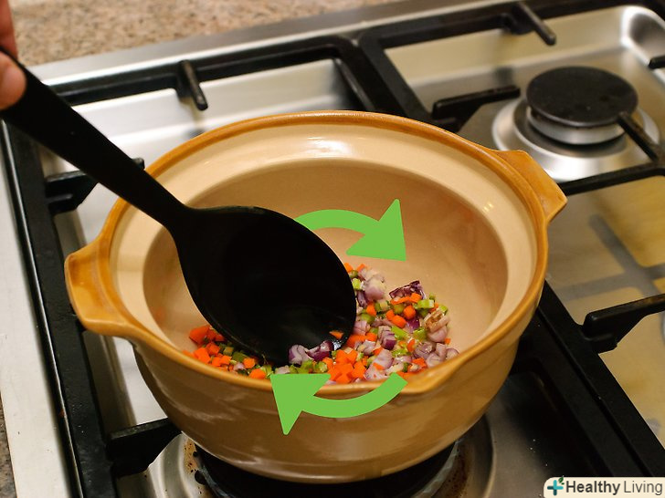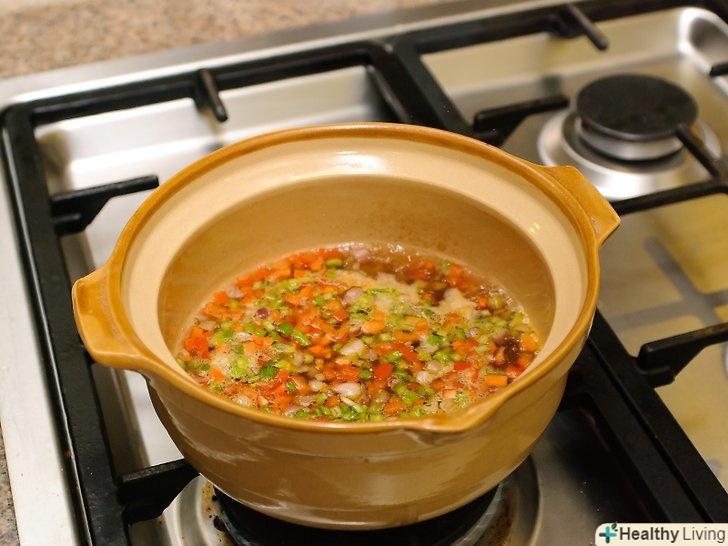 Покладіть в каструлю моркву, цибулю, селеру і посоліть.покладіть в каструлю 1 склянку подрібненої цибулі, ½ склянки дрібно нарізаної моркви, ½ склянки дрібно нарізаної селери і 2 ч.л. кошерної солі. Готуйте, поки цибуля не стане напівпрозорим. Це повинно зайняти близько 6-7 хвилин. Щоб об'єднати інгредієнти, трохи перемішайте їх.