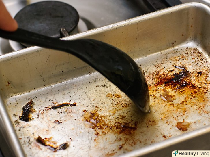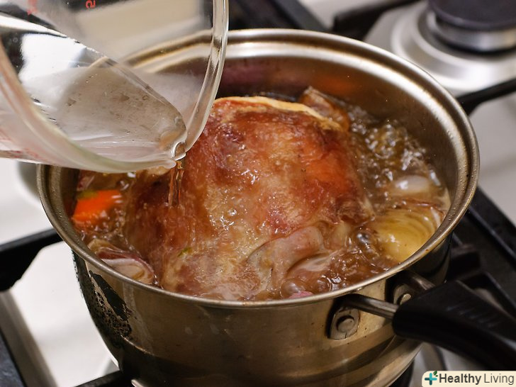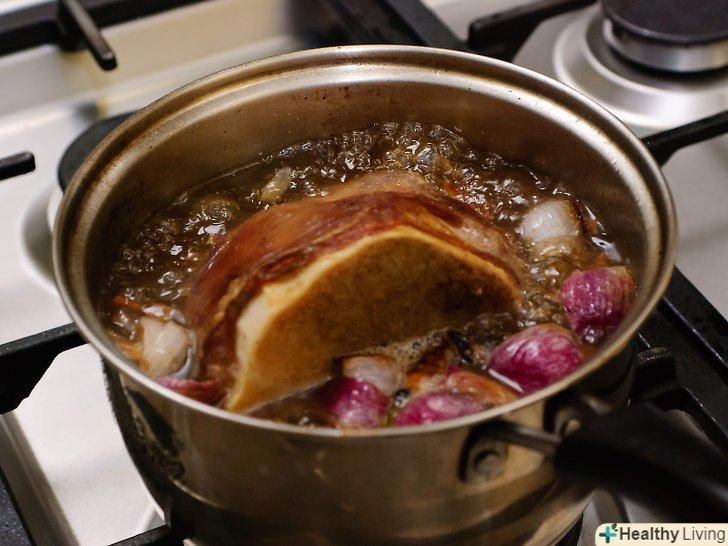 Зішкребіть залишки зі сковороди, і додайте вишкрібання до яловичого бульйону.- Зробіть підливу в сковороді. Поставте сковороду на пальник, і додайте червоне вино або воду в неї. Використовуйте дерев'яну ложку, щоб прибрати всі смажені овочі і кістки для супу. Додайте все це в яловичий бульйон.