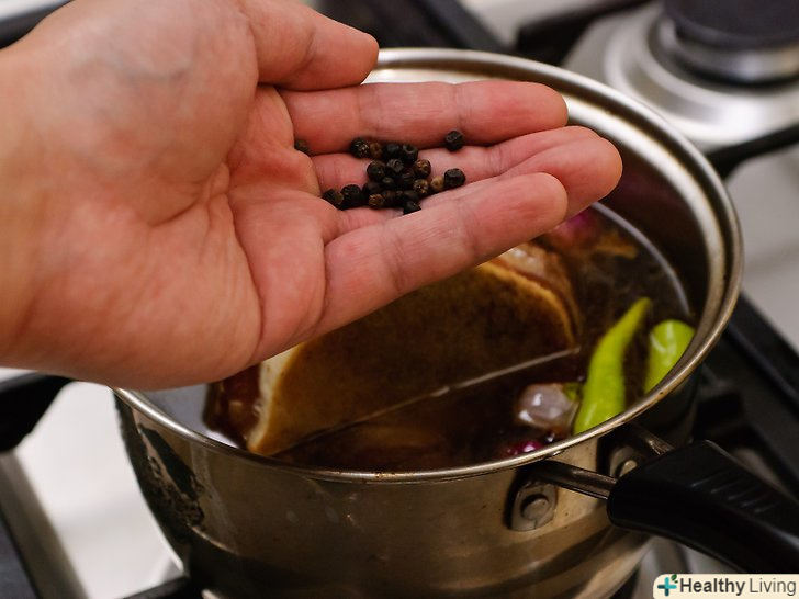 Додайте приправи до яловичого бульйону за бажанням. приправи, які ви можете додати: цілі горошини перцю, лавровий лист, петрушка, чебрець, майоран і орегано.