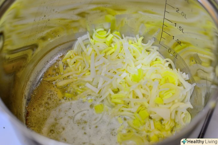 Підсмажте цибулю-порей протягом 5 хвилин, поки він не пом'якшиться, помішуючи пластиковою ложкою.