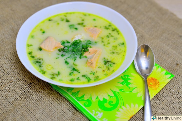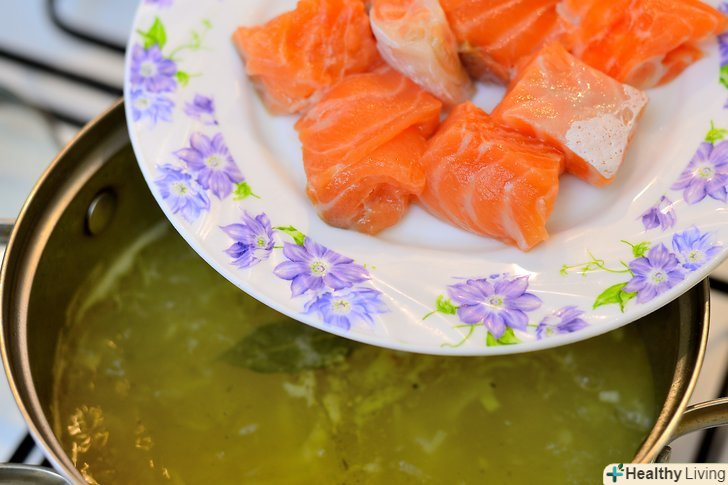Додайте скибочки лосося, вершки і кріп і варіть ще 5 хвилин.