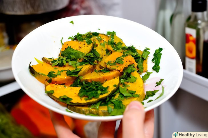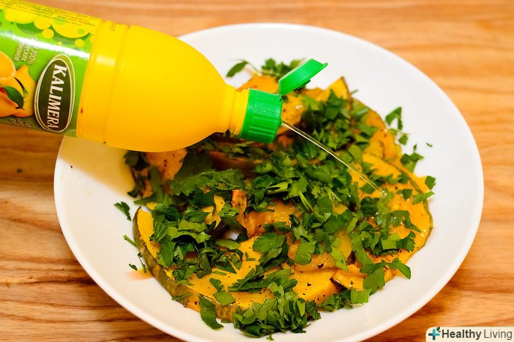 Змішайте дві столові ложки оливкової олії, часнику, солі і перцю в маленькій мисці.полийте гарбуз сумішшю і розмішайте для рівномірного покриття.