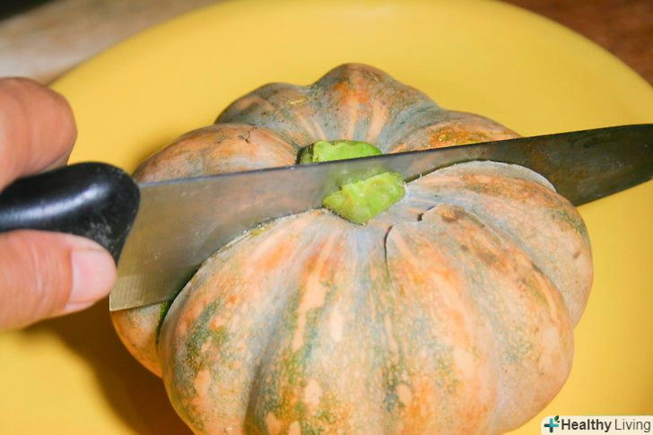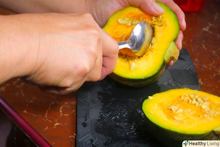 Вийміть гарбуз з мікрохвильовки.великим ножем розріжте її навпіл, від стебла до кінця. Ложкою вишкребіть насіння і волокнисті частини з центру.