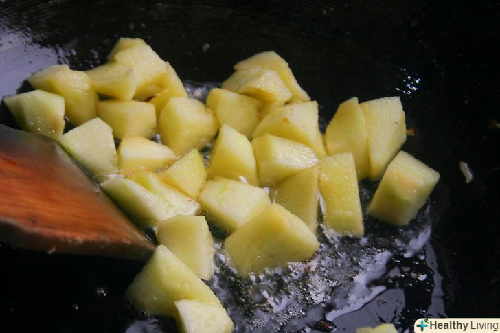 У середній каструлі, покритій сумішшю оливкової олії, обсмажте суміш нарізаних яблук до рум'яності.зніміть з вогню як тільки з'явиться золотиста скоринка.