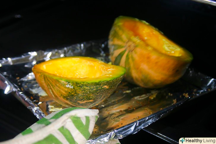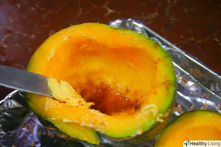 Вишкребіть насіння і волокнисті частини з центру кожної половини.покладіть кожну сторону на сковороду для запікання шкіркою вниз.- Змастіть сковороду маслом або використовуйте спрей для запобігання прилипання гарбуза до сковороди.