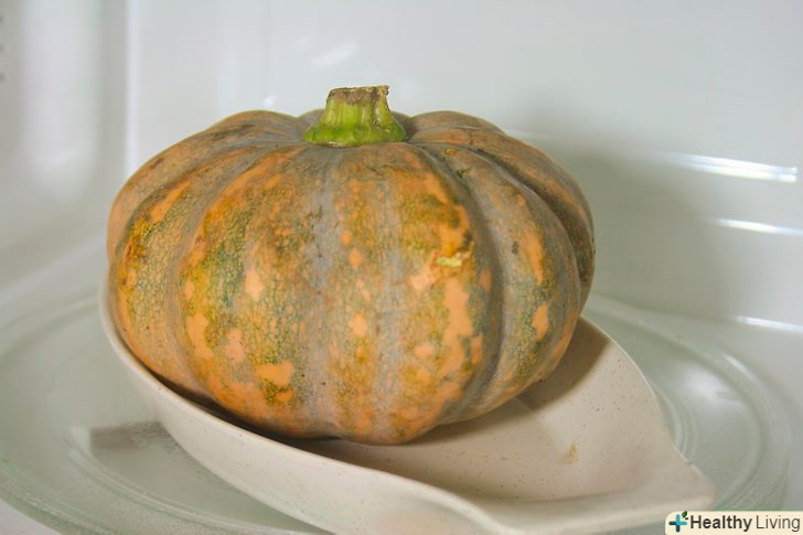 Покладіть гарбуз на тарілку і помістіть в мікрохвильовку на 4 хвилини.вийміть тарілку, переверніть гарбуз і поставте в мікрохвильовку ще на 4 хвилини.