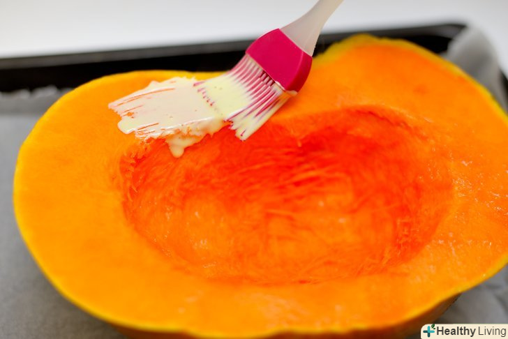 Змастіть гарбуз маслом.рясно змастіть порожнину кожної половинки розтопленим маслом.- Ви також можете використовувати оливкову олію, або суміш оливкової з вершковим.