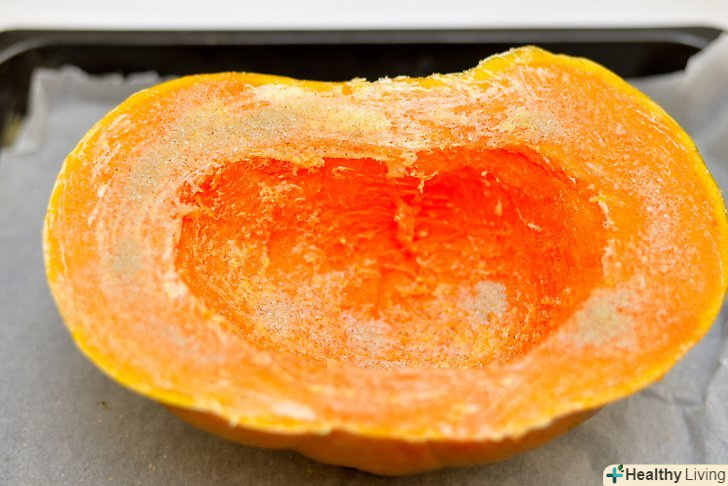 Поріжте гарбуз уздовж.видаліть насіння і грубі волокна, потім помістіть гарбуз на деко порізаною стороною вниз.