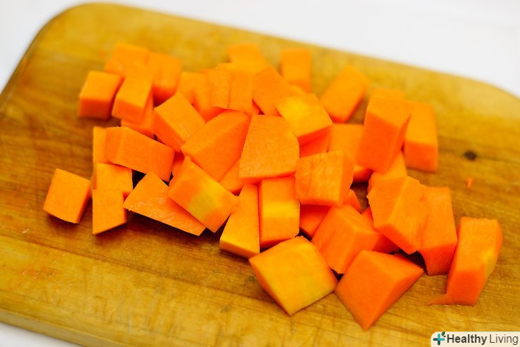 Підготуйте гарбуз.поділіть гарбуз навпіл і видаліть насіння і грубі волокна. Очистіть від шкірки, а потім поріжте на брусочки.