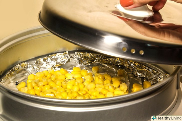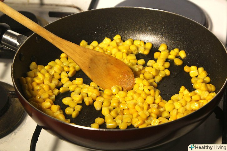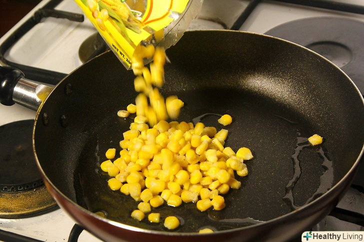 Розігрійте сковороду на середньому вогні, додайте трохи олії.поставте сковороду відповідного розміру на плиту і нагрійте на середньо-сильному вогні. Додайте масло (рослинне або вершкове), а потім, коли масло нагріється, додавайте кукурудзу. Тільки якщо масло буде гарячим, Кукурудза приготується в ньому, а не вбере його.[3]