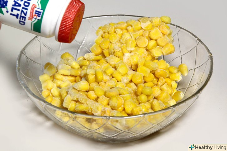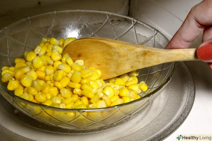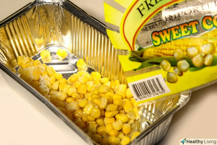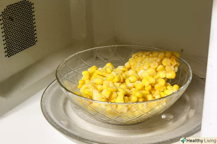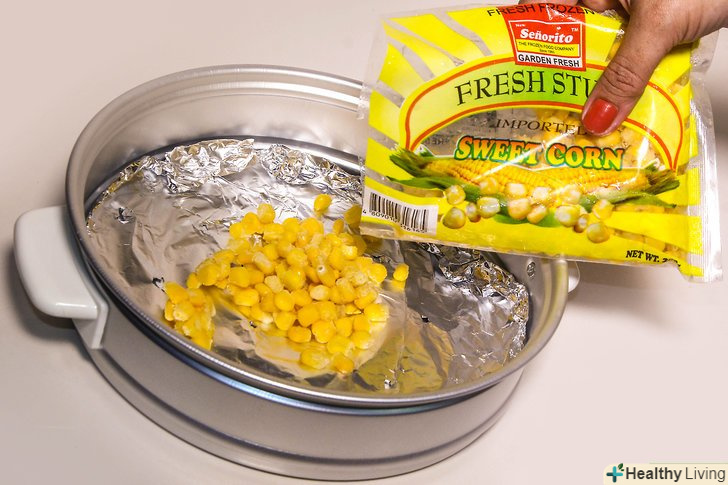 Покладіть заморожену кукурудзу в блюдо, яке можна використовувати в мікрохвильовій печі.зробіть дірку в пакеті з кукурудзою і перекладіть частину кукурудзи в блюдо, відповідне для використання в мікрохвильовій печі.[6]