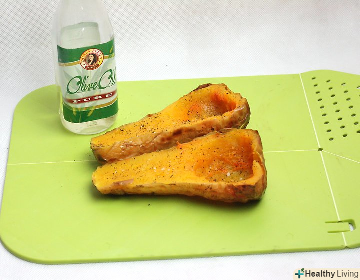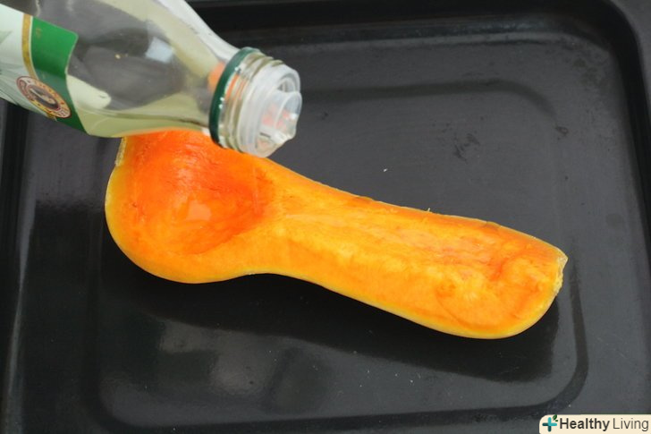Покрийте гарбуз маслом.збризніть маслом деко і шматочки гарбуза.- Оливкова олія добре підійде, але ви також можете використовувати масло волоського горіха або інші типи рослинних масел.