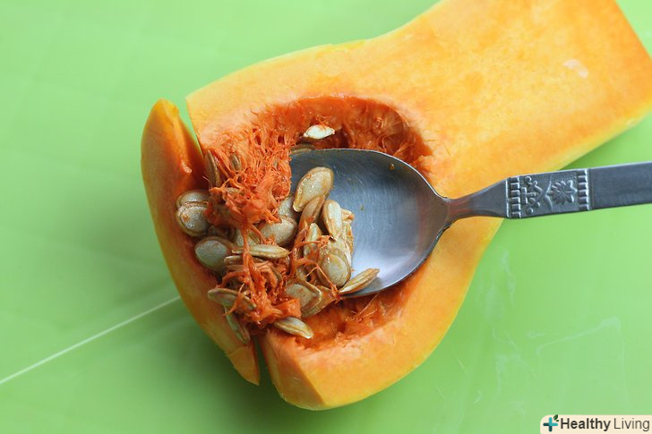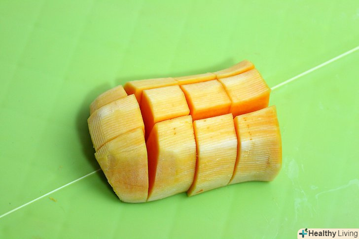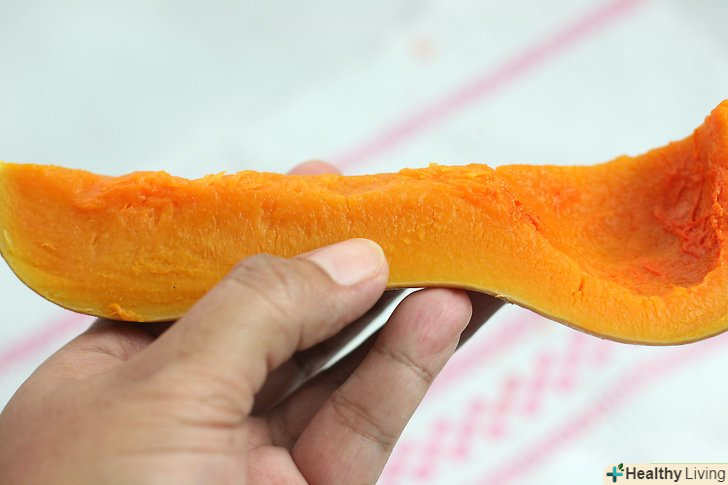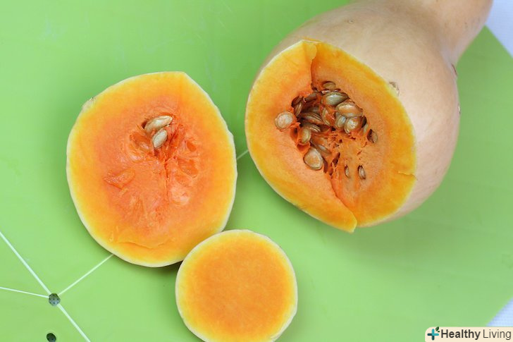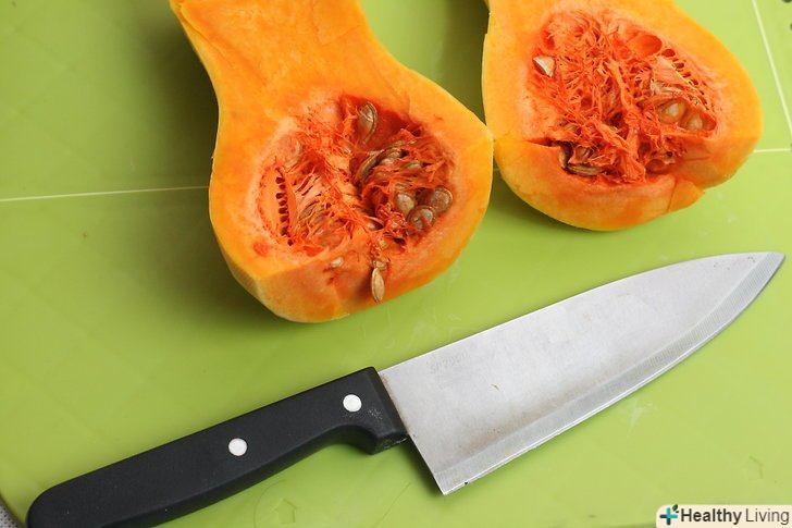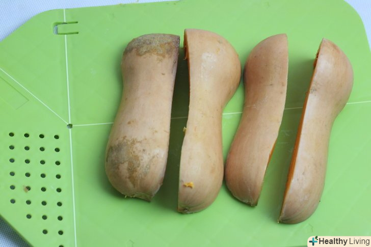 Розріжте гарбуз на 4 частини.гострим ножем розріжте гарбуз уздовж на четвертинки.- Розріжте гарбуз навпіл зверху донизу. Застосовуйте розпилює рух.