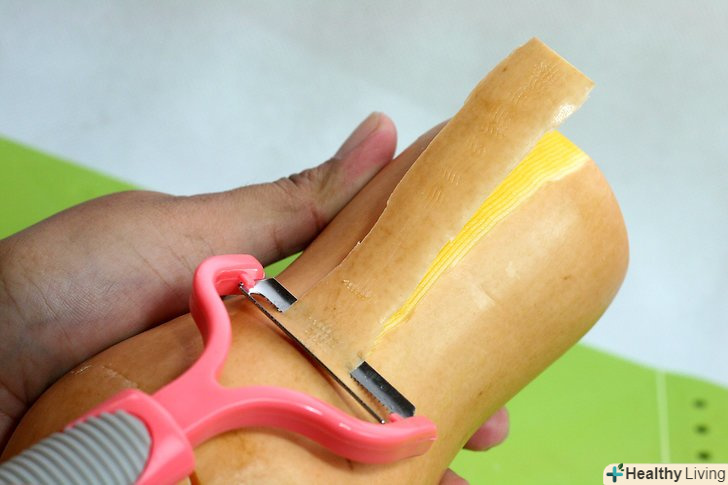 - Зазубреним овочевим ножем зріжте товсту шкірку з гарбуза до помаранчевої плоті.