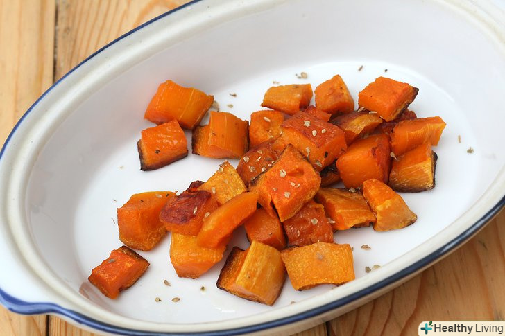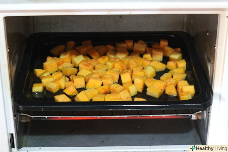 Розігрійте духовку до 220 градусів Цельсія.вистеліть неглибокий деко пергаментним папером або алюмінієвою фольгою.- Очистіть і наріжте гарбуз.очистіть шкірку ножем для овочів і гострим ножем розріжте її на 2,5 см шматочки.