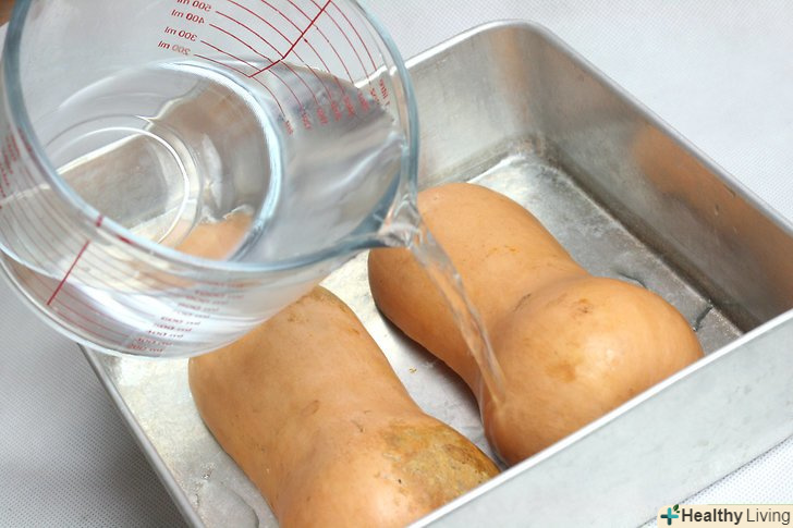 Покладіть гарбуз у форму для запікання і залийте водою.Половинки необхідно покласти розрізаною стороною вниз. Додайте у форму 1/2 склянки (125 мл) охолодженої або теплої води.- Вода запобігає прилипання гарбуза, а також створює пар, що сприяє процесу готування.