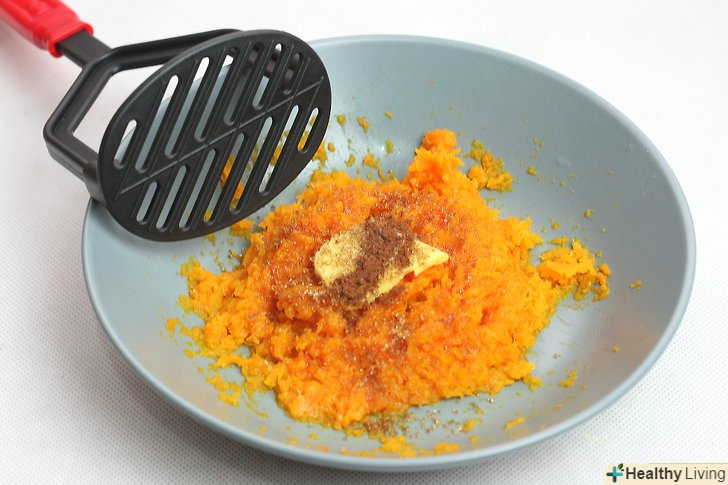 Розімніть м'якоть гарбуза з вершковим маслом, коричневим цукром і корицею.при бажанні видаліть гарячу м'якоть ложкою і покладіть її в миску. Використовуйте толкушку для картоплі і додайте в гарбуз вершкове масло, коричневий цукор і корицю.- Зачекайте кілька хвилин, після того як дістанете гарбуз з духовки.