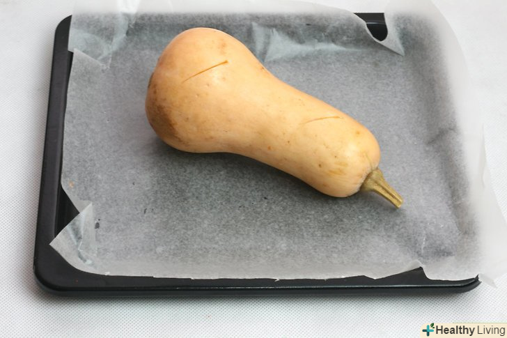 Покладіть гарбуз на деко.проколіть гарбуз гострим ножем в декількох місцях.- Кожен розріз повинен бути приблизно 2,5-5 см глибиною, а відстань між ними має бути не менше 7,6-10,2 см.