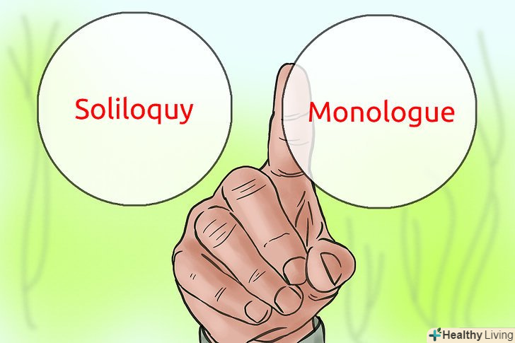 Вивчіть різницю між монологом і розмовою з самим собою.для істинного монологу необхідний інший персонаж, щоб почути його. Якщо іншого персонажа немає, то це розмова з самим собою. Він являє собою класичний метод, зазвичай не використовується в сучасній драматургії, але до сих пір застосовується в спектаклях одного актора і в експериментальних театрах.- Внутрішній монолог або голос за кадром це вже зовсім інша категорія експозиції, більше як ремарка "в сторону", ніж монолог. Для монологу необхідна присутність інших персонажів, які чують виступ, що забезпечує важливу взаємодію, яка може виявитися паливом або метою монологу.