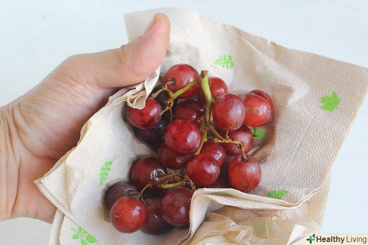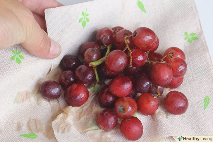 Обсушити виноград.покладіть чистий виноград на рушник або деко, покритий чистим рушником. Залиште виноград на десять хвилин, щоб ягоди обсохли. Перш ніж їсти виноград або використовувати його для приготування страви, акуратно промокніть кожну виноградину рушником, щоб видалити бактерії, пестициди і воскоподібні речовини, які могли залишитися на шкірці.[8]