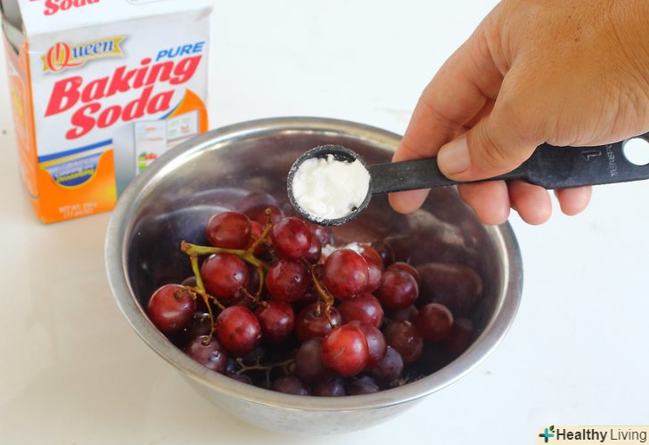 Вимийте виноград за допомогою соди і повіреної солі.акуратно відокремте виноградини від гілочок, покладіть в чисту миску і ретельно промийте прохолодною проточною водою. Візьміть по одній-дві чайні ложки повіреної солі і соди і опудріть цим порошком виноградини. Енергійно потрясіть миску з боку в бік протягом 30-60 секунд. Ретельно промийте виноград водою-це допоможе видалити пестициди, бактерії та інші шкідливі речовини, а також сіль і соду.[15]- Акуратно потріть кожну виноградину пальцями, коли будете промивати виноград вдруге. Так ви видалите з шкірки залишки солі і соди.