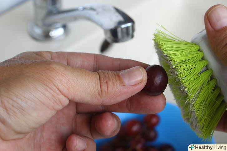 Вимийте виноград щіткою для харчових продуктів.візьміть щітку, призначену для миття харчових продуктів. Коли ви заллєте виноград водою або розчином оцту, акуратно потріть щіткою кожну виноградину. Це видалить Пестициди та інші хімічні речовини, а також дозволить позбутися від 85% бактерій.[16]