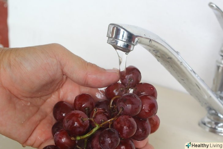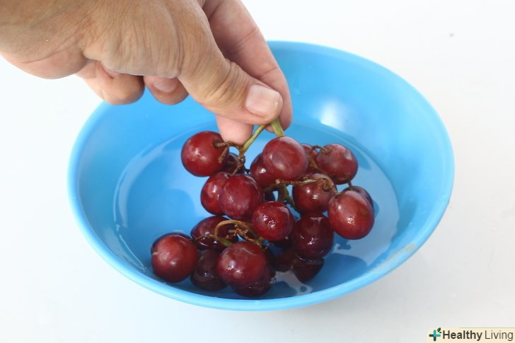 Вимийте виноград. Відокремте від грона бажану кількість винограду. Підставте виноград під струмінь прохолодної проточної води і тримайте протягом тридцяти секунд. Акуратно потріть поверхню виноградин пальцями.[4] Таким способом можна видалити близько 85 % бактерій, а також змити бПрольшую частина пестицидів з поверхні виноградин.[5]- Ви можете мити виноград, тримаючи його в руках або помістивши в друшляк.