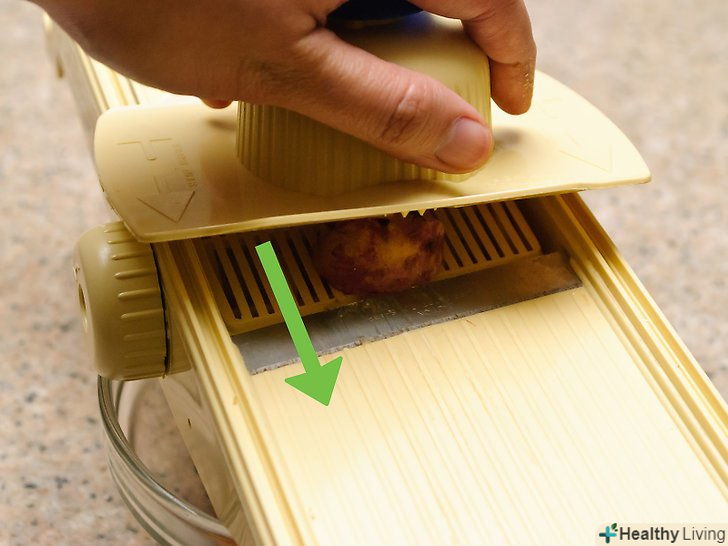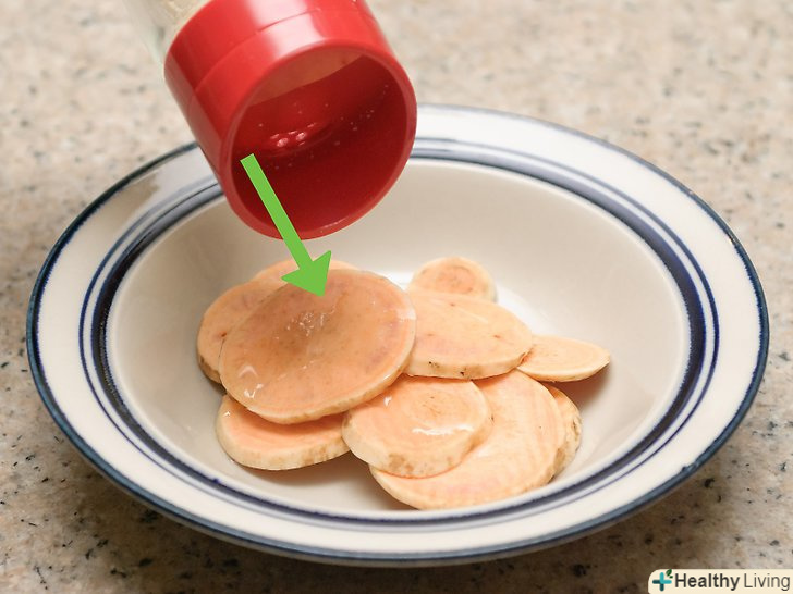 Помийте і наріжте солодку картоплю.протріть два великих батата під холодною водою і витріть їх насухо. Гострим ножем розріжте солодку картоплю на максимально тонкі шматочки. Щоб спростити собі завдання, наріжте картоплю на овочерізки. Овочерізка дозволить зробити чіпси більш однорідними.[7]- Оскільки ви не будете очищати картоплю від шкірки, візьміть органічну солодку картоплю. Дослідження пестицидів показали, що в картоплі вони концентруються саме в шкірці.[8]