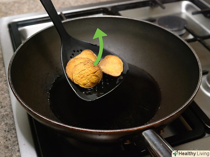 Смажте солодку картоплю партіями.обережно опустіть жменю скибочок солодкої картоплі в гаряче масло. Дуже скоро вони почнуть підсмажуватися і ставати коричневими і вигнутими. Кожну партію потрібно смажити не довше однієї хвилини.[4]- Смажте по одній партії солодкої картоплі за раз. Якщо додасте більше, температура масла швидко впаде і картопля не прожариться належним чином.