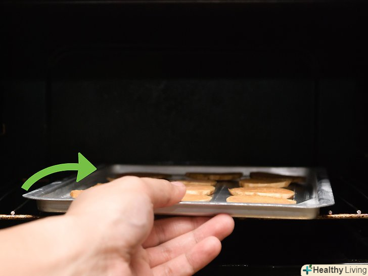 Запечіть чіпси з батату.розкладіть чіпси на одному-двох деках, щоб вони лежали плазом на одному рівні. Запікайте чіпси протягом години. Витягніть їх з духовки і акуратно переверніть. Поверніть чіпси в духовку і залиште їх там ще на годину.[11]- Перевертайте чіпси в процесі готування-це дозволить отримати хрустку скоринку з обох сторін.