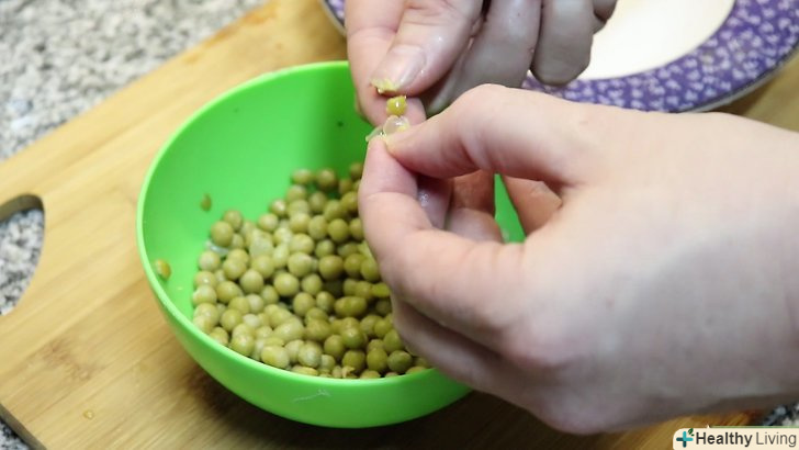 Підготуйте горох.даний метод годиться як для замороженого, так і свіжого гороху. Однак він не підходить для зеленого горошку в стручках і цукрового гороху. Підготуйте горох одним з наступних способів:- Свіжий горох: відірвіть стебло і потягніть його вниз, щоб видалити скріплює стулки волокно. Розкрийте стручок і проведіть уздовж його внутрішньої частини великим пальцем, щоб витягти горошини.