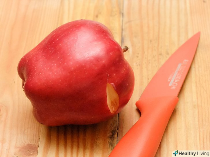 Уважно огляньте яблука.перш ніж мити яблука, гарненько огляньте плоди. Перевірте, чи немає на поверхні фруктів цвілі, вм'ятин та інших пошкоджень. Якщо ви виявили цвіль або вм'ятину, виріжте пошкоджене місце ножем, а потім вимийте яблука.[1]- Якщо ви купуєте яблука в супермаркеті, вибирайте плоди без пошкоджень.