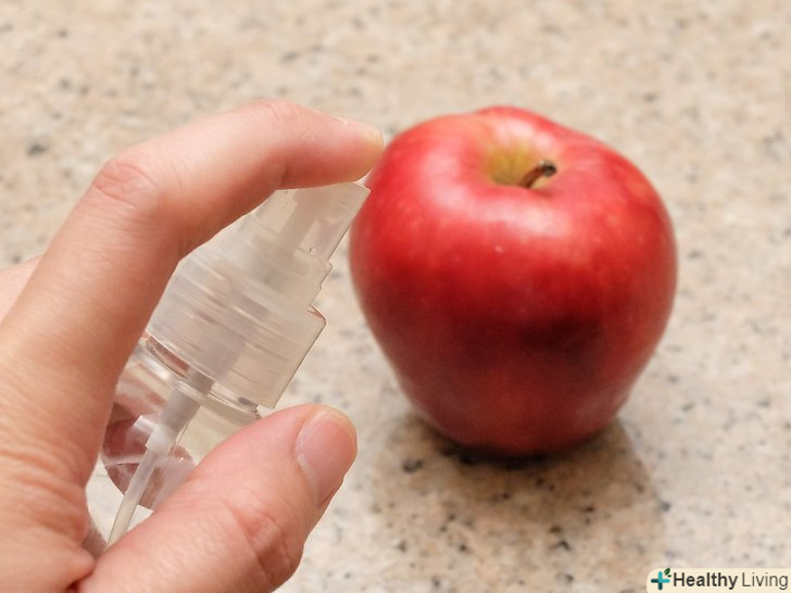 Обприскати яблука з пульверизатора.не потрібно замочувати яблука в розчин оцту-це може пошкодити плоди. Для ефективного очищення фруктів досить розпорошити розчин, щоб він покривав всю поверхню яблука. У більшості випадків достатньо шести натискань, щоб обприскати яблуко з усіх боків.[6]