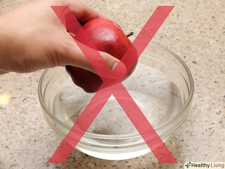 Не варто мити яблука зі спеціальними засобами.у більшості випадків абсолютно зайве замочувати яблука в спеціальному розчині або використовувати для миття що-небудь крім води або розчину оцту. Новомодні засоби для миття фруктів, при використанні яких яблука потрібно замочувати в розчині, досить часто змінюють смак плодів. Щоб вимити яблука, цілком достатньо звичайної води, а якщо ваші плоди дуже брудні, вам на допомогу прийде оцет. Спеціальні продукти для ретельного миття фруктів навряд чи вимиють яблука краще, ніж перевірені часом кошти.[8]