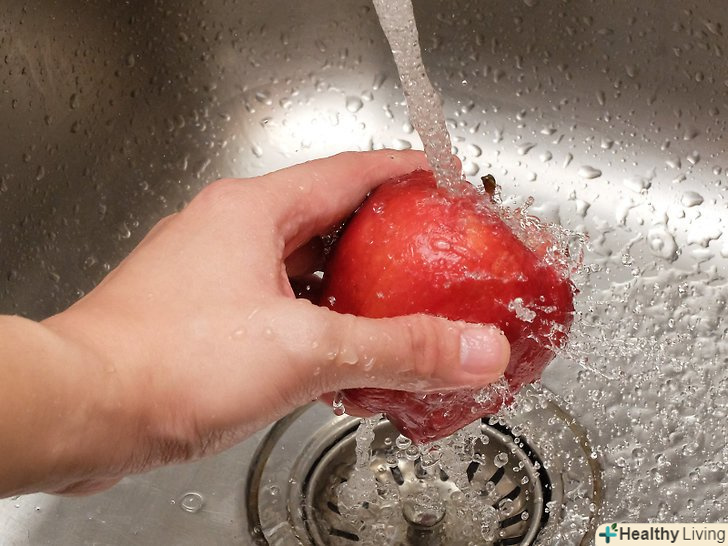 Вимийте яблука під проточною водою.щоб видалити з поверхні фруктів забруднення і бактерії, досить вимити їх водопровідною водою. Відкрийте кран і підставте яблуко під струмінь води, повертаючи його в міру необхідності, щоб вимити з усіх боків. Вимите яблуко потрібно витерти тканинним або паперовим кухонним рушником.[3]