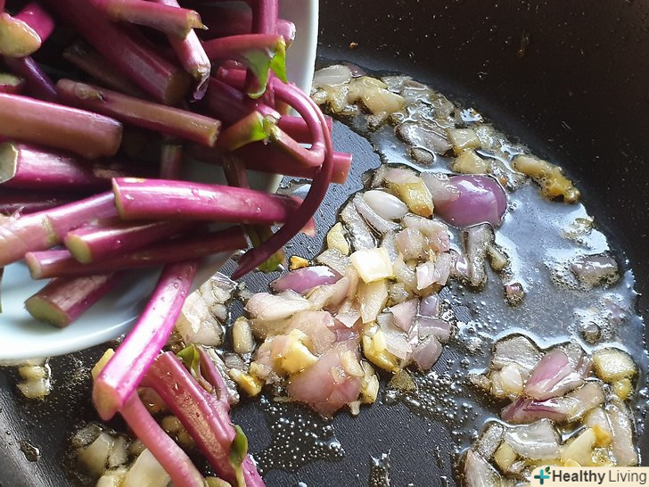 Обсмажте мангольд на середньому вогні.помістіть 2-3 столові ложки оливкової або вершкового масла в каструлю і почекайте, поки воно нагріється. Потім додайте стебла мангольда і варіть їх протягом 2-3 хвилин, перш ніж додати листя. Ви навіть можете нарізати стебла 10 сантиметровими шматочками, щоб було легше перемішувати. Продовжіть приготування мангольда ще до п'яти хвилин, поки він не стане м'яким.