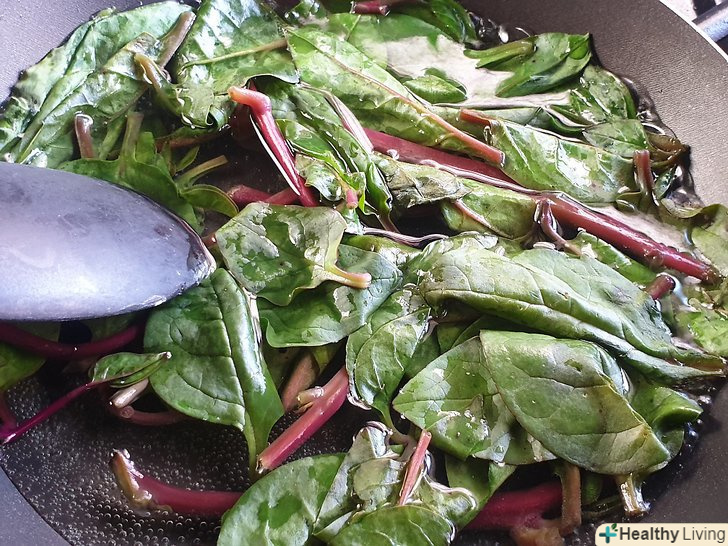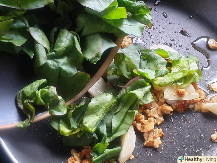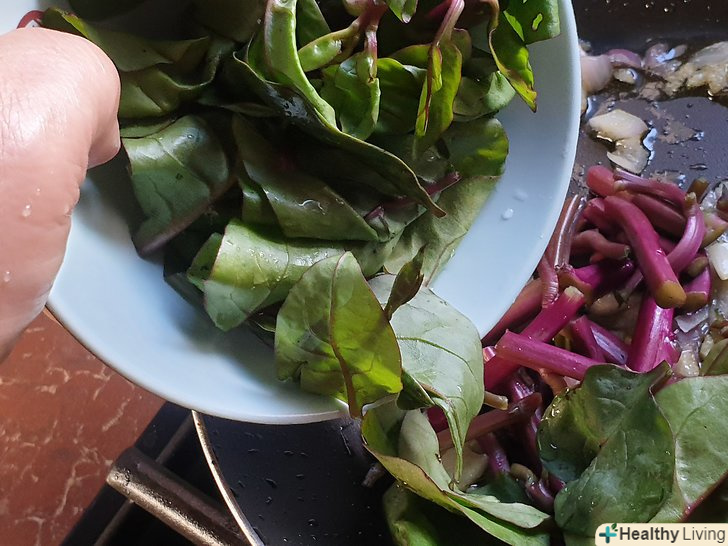 Змішайте листя.готуйте мангольд, поки листя не зів'яли, принаймні, ще 3 хвилини. Вимкніть вогонь і покладіть мангольд в миску.