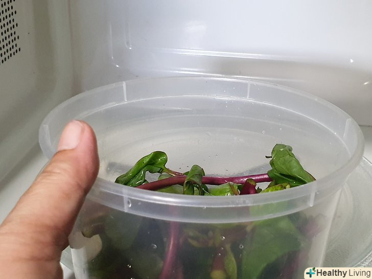 Пропарьте мангольд в мікрохвильовій печі.Пропарьте мангольд з тонкими ребрами цілим в мікрохвильовій печі з водою, яка залишається на його листі після миття. Це повинно зайняти від 1 до 2 хвилин. Мікрохвильові печі розрізняються за інтенсивністю, так що не забудьте перевіряти мангольд часто, поки не визначили, скільки часу потрібно, щоб приготувати в мікрохвильовій печі. Якщо ви пересмажити, він просочиться водою, тому почніть перевіряти його зовнішній вигляд після першої хвилини.